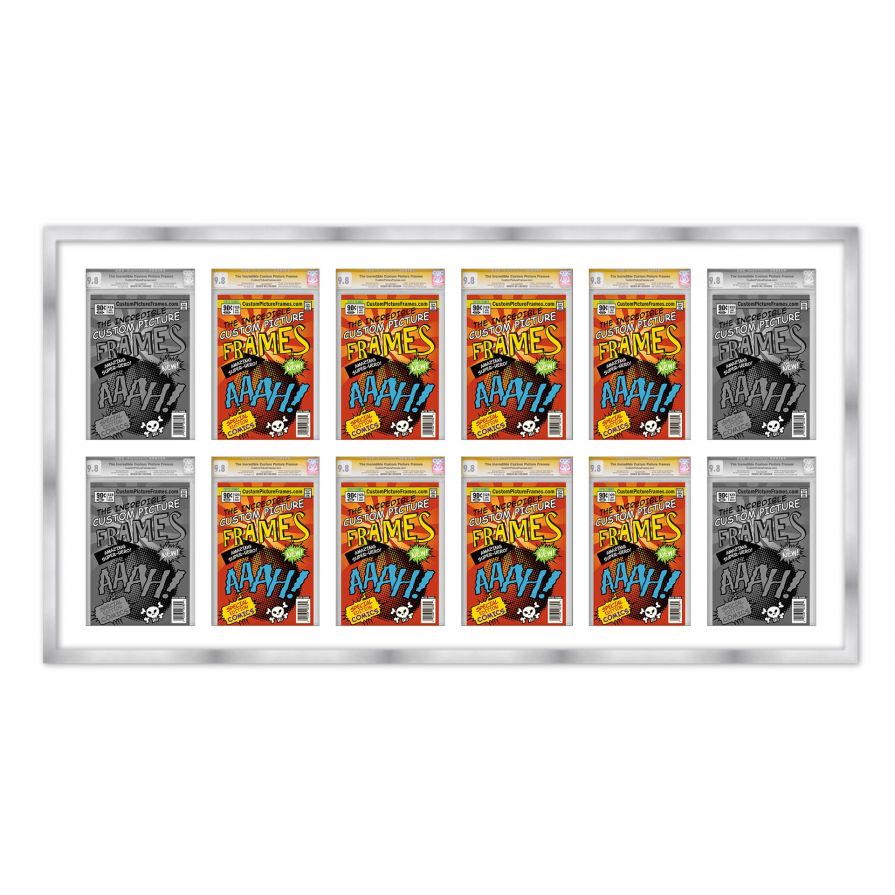 Share your comic collection by putting your comic books on display in a high-quality wood frame. Includes nesting foam to snuggly and securely hold your comic books in place. This frame features a silver finish and your choice of black or white acid-free matting to display 12 graded comic books horizontally. Also included are a UV-resistant acrylic protective front, foam board backing, easel stand, and wall hanging hardware. This frame displays twelve CGC, CBCS or PGX graded comic books measuring 8.125x13 inches. This moulding is 0.75 inches wide. The overall dimensions of this frame are 54.5x31 inches. Includes nesting foam to snuggly and securely hold your comic books in place. This graded comic book frame for your CGC, CBCS or PGX graded comic books makes a great gift or addition to your home or office! Display your prized comic book collection in style with a handcrafted frame by Custom Picture Frames.