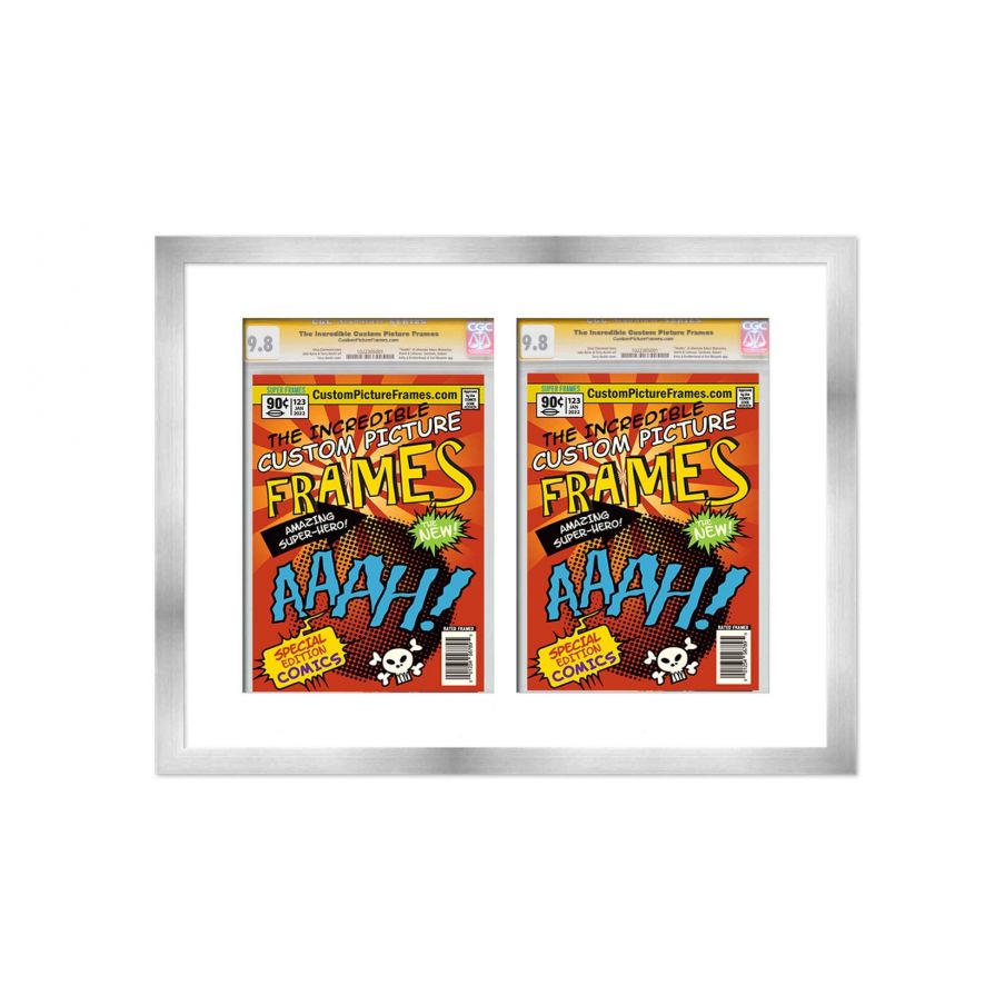 Share your comic collection by putting your comic books on display in a high-quality wood frame.This frame features a silver finish and your choice of black or white acid-free matting to display 2 graded comic books. Also included are a UV-resistant acrylic protective front, foam board backing, easel stand, and wall hanging hardware. This frame displays two CGC, CBCS or PGX graded comic books measuring 8.125x13 inches. This moulding is 0.75 inches wide. The overall dimensions of this frame are 18.5x22.5 inches. Includes nesting foam to snuggly and securely hold your comic books in place. This double graded comic book frame for your CGC, CBCS or PGX graded comic books makes a great gift or addition to your home or office! Display your prized comic book collection in style with a handcrafted frame by Custom Picture Frames.
