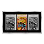 Share your comic collection by putting your comic books on display in a high-quality wood frame. Includes nesting foam to snuggly and securely hold your comic books in place. This frame features a silver finish and your choice of black or white acid-free matting to display 3 graded comic books. Also included are a UV-resistant acrylic protective front, foam board backing, easel stand, and wall hanging hardware. This frame displays three CGC, CBCS or PGX graded comic books measuring 8.125x13 inches. This moulding is 0.75 inches wide. The overall dimensions of this frame are 31.75x18 inches. Includes nesting foam to snuggly and securely hold your comic books in place. This triple graded comic book frame for your CGC, CBCS or PGX graded comic books makes a great gift or addition to your home or office! Display your prized comic book collection in style with a handcrafted frame by Custom Picture Frames.