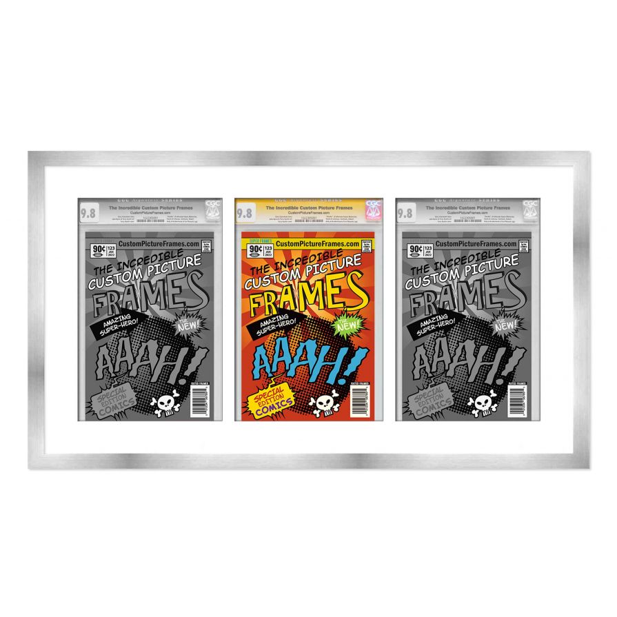 Share your comic collection by putting your comic books on display in a high-quality wood frame. Includes nesting foam to snuggly and securely hold your comic books in place. This frame features a silver finish and your choice of black or white acid-free matting to display 3 graded comic books. Also included are a UV-resistant acrylic protective front, foam board backing, easel stand, and wall hanging hardware. This frame displays three CGC, CBCS or PGX graded comic books measuring 8.125x13 inches. This moulding is 0.75 inches wide. The overall dimensions of this frame are 31.75x18 inches. Includes nesting foam to snuggly and securely hold your comic books in place. This triple graded comic book frame for your CGC, CBCS or PGX graded comic books makes a great gift or addition to your home or office! Display your prized comic book collection in style with a handcrafted frame by Custom Picture Frames.