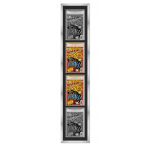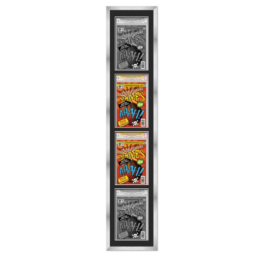 Share your comic collection by putting your comic books on display in a high-quality wood frame. Includes nesting foam to snuggly and securely hold your comic books in place. This frame features a silver finish and your choice of black or white acid-free matting to display 4 graded comic books vertically. Also included are a UV-resistant acrylic protective front, foam board backing, easel stand, and wall hanging hardware. This frame displays four CGC, CBCS or PGX graded comic books measuring 8.125x13 inches. This moulding is 0.75 inches wide. The overall dimensions of this frame are 13.125x58.5 inches. Includes nesting foam to snuggly and securely hold your comic books in place. This graded comic book frame for your CGC, CBCS or PGX graded comic books makes a great gift or addition to your home or office! Display your prized comic book collection in style with a handcrafted frame by Custom Picture Frames.