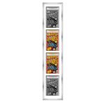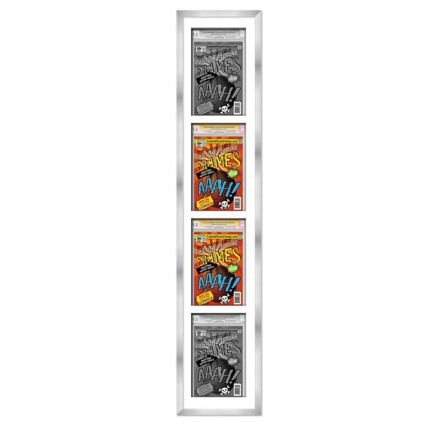 Share your comic collection by putting your comic books on display in a high-quality wood frame. Includes nesting foam to snuggly and securely hold your comic books in place. This frame features a silver finish and your choice of black or white acid-free matting to display 4 graded comic books vertically. Also included are a UV-resistant acrylic protective front, foam board backing, easel stand, and wall hanging hardware. This frame displays four CGC, CBCS or PGX graded comic books measuring 8.125x13 inches. This moulding is 0.75 inches wide. The overall dimensions of this frame are 13.125x58.5 inches. Includes nesting foam to snuggly and securely hold your comic books in place. This graded comic book frame for your CGC, CBCS or PGX graded comic books makes a great gift or addition to your home or office! Display your prized comic book collection in style with a handcrafted frame by Custom Picture Frames.