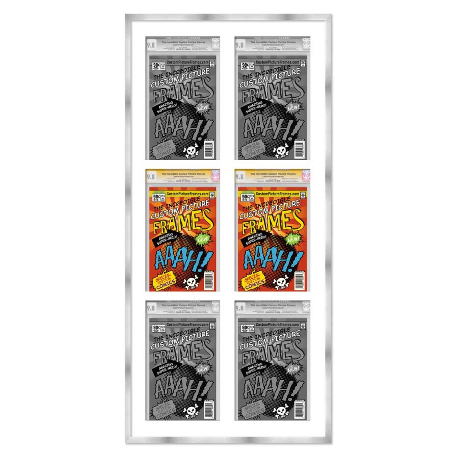 Share your comic collection by putting your comic books on display in a high-quality wood frame. Includes nesting foam to snuggly and securely hold your comic books in place. This frame features a silver finish and your choice of black or white acid-free matting to display 6 graded comic books vertically. Also included are a UV-resistant acrylic protective front, foam board backing, easel stand, and wall hanging hardware. This frame displays six CGC, CBCS or PGX graded comic books measuring 8.125x13 inches. This moulding is 0.75 inches wide. The overall dimensions of this frame are 22.25x46 inches. Includes nesting foam to snuggly and securely hold your comic books in place. This graded comic book frame for your CGC, CBCS or PGX graded comic books makes a great gift or addition to your home or office! Display your prized comic book collection in style with a handcrafted frame by Custom Picture Frames.