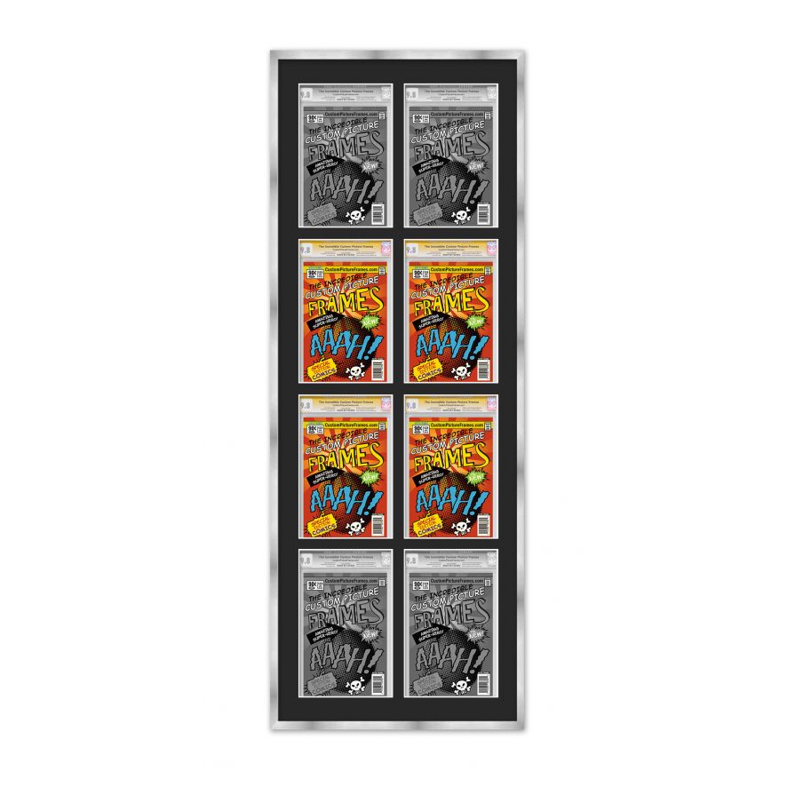 Share your comic collection by putting your comic books on display in a high-quality wood frame. Includes nesting foam to snuggly and securely hold your comic books in place. This frame features a silver finish and your choice of black or white acid-free matting to display 8 graded comic books vertically. Also included are a UV-resistant acrylic protective front, foam board backing, easel stand, and wall hanging hardware. This frame displays eight CGC, CBCS or PGX graded comic books measuring 8.125x13 inches. This moulding is 0.75 inches wide. The overall dimensions of this frame are 22.5x60 inches. Includes nesting foam to snuggly and securely hold your comic books in place. This graded comic book frame for your CGC, CBCS or PGX graded comic books makes a great gift or addition to your home or office! Display your prized comic book collection in style with a handcrafted frame by Custom Picture Frames.