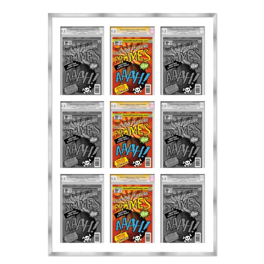 Share your comic collection by putting your comic books on display in a high-quality wood frame. Includes nesting foam to snuggly and securely hold your comic books in place. This frame features a silver finish and your choice of black or white acid-free matting to display 9 graded comic books. Also included are a UV-resistant acrylic protective front, foam board backing, easel stand, and wall hanging hardware. This frame displays nine CGC, CBCS or PGX graded comic books measuring 8.125x13 inches. This moulding is 0.75 inches wide. The overall dimensions of this frame are 31.5x46 inches. Includes nesting foam to snuggly and securely hold your comic books in place. This graded comic book frame for your CGC, CBCS or PGX graded comic books makes a great gift or addition to your home or office! Display your prized comic book collection in style with a handcrafted frame by Custom Picture Frames.
