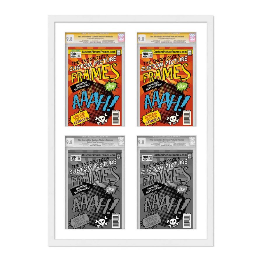 Share your comic collection by putting your comic books on display in a high-quality wood frame. Includes nesting foam to snuggly and securely hold your comic books in place. This frame features a white finish and your choice of black or white acid-free matting to display 4 graded comic books in a 2x2 grid collage. Also included are a UV-resistant acrylic protective front, foam board backing, easel stand, and wall hanging hardware. This frame displays four CGC, CBCS or PGX graded comic books measuring 8.125x13 inches. This moulding is 0.75 inches wide. The overall dimensions of this frame are 22.25x32 inches. Includes nesting foam to snuggly and securely hold your comic books in place. This graded comic book frame for your CGC, CBCS or PGX graded comic books makes a great gift or addition to your home or office! Display your prized comic book collection in style with a handcrafted frame by Custom Picture Frames.