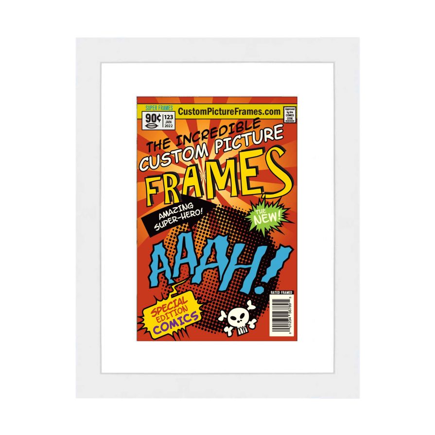 Share your comic collection by putting your comic books on display in a high-quality wood frame.This frame features a white finish and your choice of black or white acid-free matting. Also included are a UV-resistant acrylic protective front, foam board backing, easel stand, and wall hanging hardware. This frame displays Bronze Age (Published Between 1970 and 1985) comic books measuring 7.25x10.5 inches, Golden Age (Published Between 1938 and 1956) comic books measuring 7.75x10.5 inches, Silver Age (Published Between 1956 and 1970) comic books measuring 7.125x10.5 inches or Current Era (Published After 1985) comic books measuring 6.875x10.5 inches. This moulding is 0.75 inches wide. The overall dimensions of this frame are 11.5"x15.5" inches. Includes nesting foam to snuggly and securely hold your comic books in place. This single comic book frame for your Bronze, Golden, Silver or Current comic books makes a great gift or addition to your home or office! Display your prized comic book collection in style with a handcrafted frame by Custom Picture Frames.