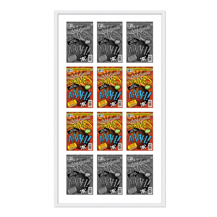 Share your comic collection by putting your comic books on display in a high-quality wood frame. Includes nesting foam to snuggly and securely hold your comic books in place. This frame features a white finish and your choice of black or white acid-free matting to display 12 comic books. Also included are a UV-resistant acrylic protective front, foam board backing, easel stand, and wall hanging hardware. This frame displays twelve Bronze Age (Published Between 1970 and 1985) comic books measuring 7.25x10.5 inches, Golden Age (Published Between 1938 and 1956) comic books measuring 7.75x10.5 inches, Silver Age (Published Between 1956 and 1970) comic books measuring 7.125x10.5 inches or Current Era (Published After 1985) comic books measuring 6.875x10.5 inches. This moulding is 0.75 inches wide. The overall dimensions of this frame are 30.5x52 inches. Includes nesting foam to snuggly and securely hold your comic books in place. This comic book frame for your Bronze, Golden, Silver or Current comic books makes a great gift or addition to your home or office! Display your prized comic book collection in style with a handcrafted frame by Custom Picture Frames.