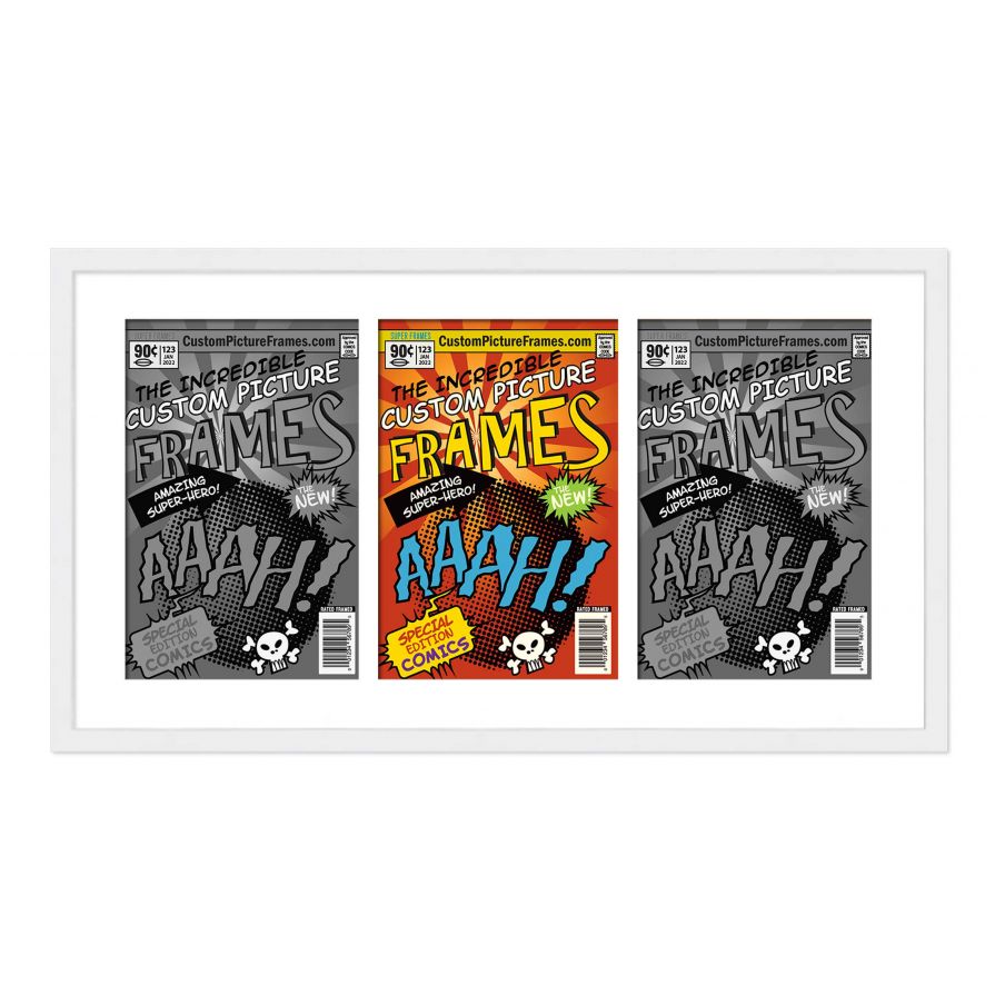 Share your comic collection by putting your comic books on display in a high-quality wood frame. Includes nesting foam to snuggly and securely hold your comic books in place. This frame features a white finish and your choice of black or white acid-free matting to display 3 comic books. Also included are a UV-resistant acrylic protective front, foam board backing, easel stand, and wall hanging hardware. This frame displays three Bronze Age (Published Between 1970 and 1985) comic books measuring 7.25x10.5 inches, Golden Age (Published Between 1938 and 1956) comic books measuring 7.75x10.5 inches, Silver Age (Published Between 1956 and 1970) comic books measuring 7.125x10.5 inches or Current Era (Published After 1985) comic books measuring 6.875x10.5 inches. This moulding is 0.75 inches wide. The overall dimensions of this frame are 30.25x15.5 inches. Includes nesting foam to snuggly and securely hold your comic books in place. This triple comic book frame for your Bronze, Golden, Silver or Current comic books makes a great gift or addition to your home or office! Display your prized comic book collection in style with a handcrafted frame by Custom Picture Frames.