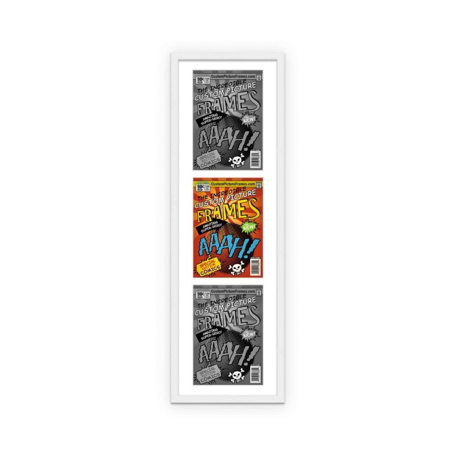 Share your comic collection by putting your comic books on display in a high-quality wood frame. Includes nesting foam to snuggly and securely hold your comic books in place. This frame features a white finish and your choice of black or white acid-free matting to display 3 comic books vertically. Also included are a UV-resistant acrylic protective front, foam board backing, easel stand, and wall hanging hardware. This frame displays three Bronze Age (Published Between 1970 and 1985) comic books measuring 7.25x10.5 inches, Golden Age (Published Between 1938 and 1956) comic books measuring 7.75x10.5 inches, Silver Age (Published Between 1956 and 1970) comic books measuring 7.125x10.5 inches or Current Era (Published After 1985) comic books measuring 6.875x10.5 inches. This moulding is 0.75 inches wide. The overall dimensions of this frame are 12.75x37.5 inches. Includes nesting foam to snuggly and securely hold your comic books in place. This triple comic book frame for your Bronze, Golden, Silver or Current comic books makes a great gift or addition to your home or office! Display your prized comic book collection in style with a handcrafted frame by Custom Picture Frames.