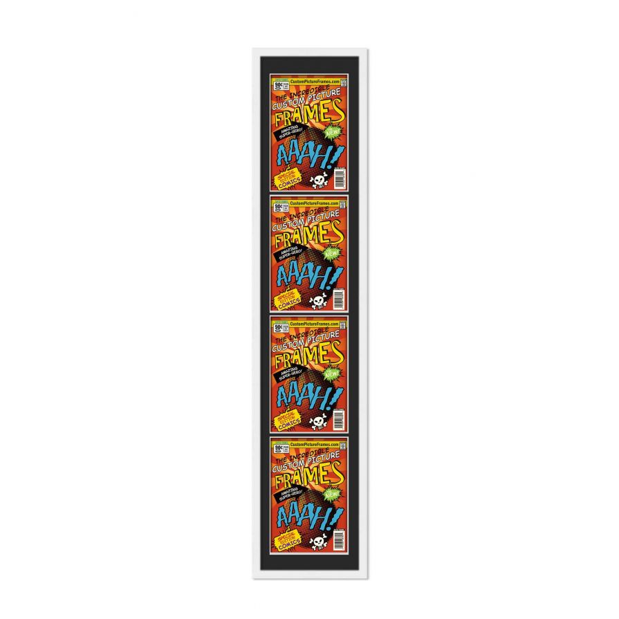 Share your comic collection by putting your comic books on display in a high-quality wood frame. Includes nesting foam to snuggly and securely hold your comic books in place. This frame features a white finish and your choice of black or white acid-free matting to display 4 comic books vertically. Also included are a UV-resistant acrylic protective front, foam board backing, easel stand, and wall hanging hardware. This frame displays four Bronze Age (Published Between 1970 and 1985) comic books measuring 7.25x10.5 inches, Golden Age (Published Between 1938 and 1956) comic books measuring 7.75x10.5 inches, Silver Age (Published Between 1956 and 1970) comic books measuring 7.125x10.5 inches or Current Era (Published After 1985) comic books measuring 6.875x10.5 inches. This moulding is 0.75 inches wide. The overall dimensions of this frame are 12.75x48.5 inches. Includes nesting foam to snuggly and securely hold your comic books in place. This comic book frame for your Bronze, Golden, Silver or Current comic books makes a great gift or addition to your home or office! Display your prized comic book collection in style with a handcrafted frame by Custom Picture Frames.