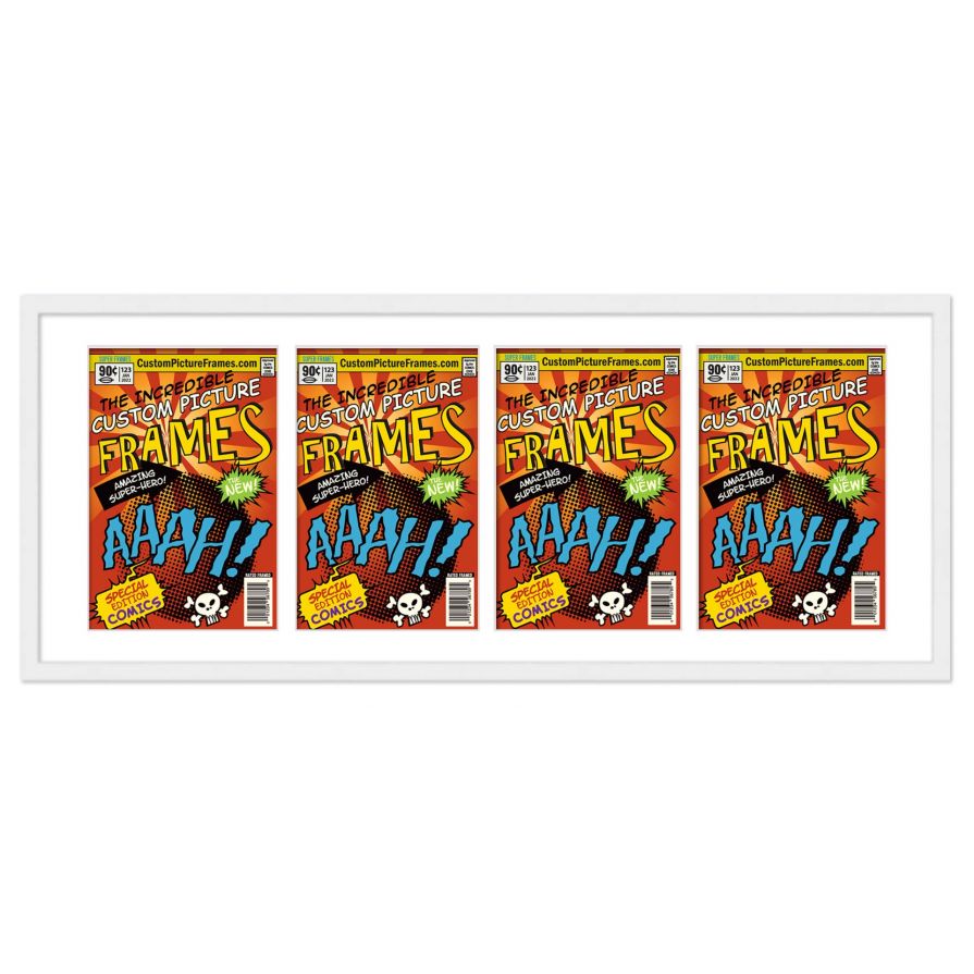 Share your comic collection by putting your comic books on display in a high-quality wood frame. Includes nesting foam to snuggly and securely hold your comic books in place. This frame features a white finish and your choice of black or white acid-free matting to display 4 comic books. Also included are a UV-resistant acrylic protective front, foam board backing, easel stand, and wall hanging hardware. This frame displays four Bronze Age (Published Between 1970 and 1985) comic books measuring 7.25x10.5 inches, Golden Age (Published Between 1938 and 1956) comic books measuring 7.75x10.5 inches, Silver Age (Published Between 1956 and 1970) comic books measuring 7.125x10.5 inches or Current Era (Published After 1985) comic books measuring 6.875x10.5 inches. This moulding is 0.75 inches wide. The overall dimensions of this frame are 39x15.5 inches. Includes nesting foam to snuggly and securely hold your comic books in place. This comic book frame for your Bronze, Golden, Silver or Current comic books makes a great gift or addition to your home or office! Display your prized comic book collection in style with a handcrafted frame by Custom Picture Frames.
