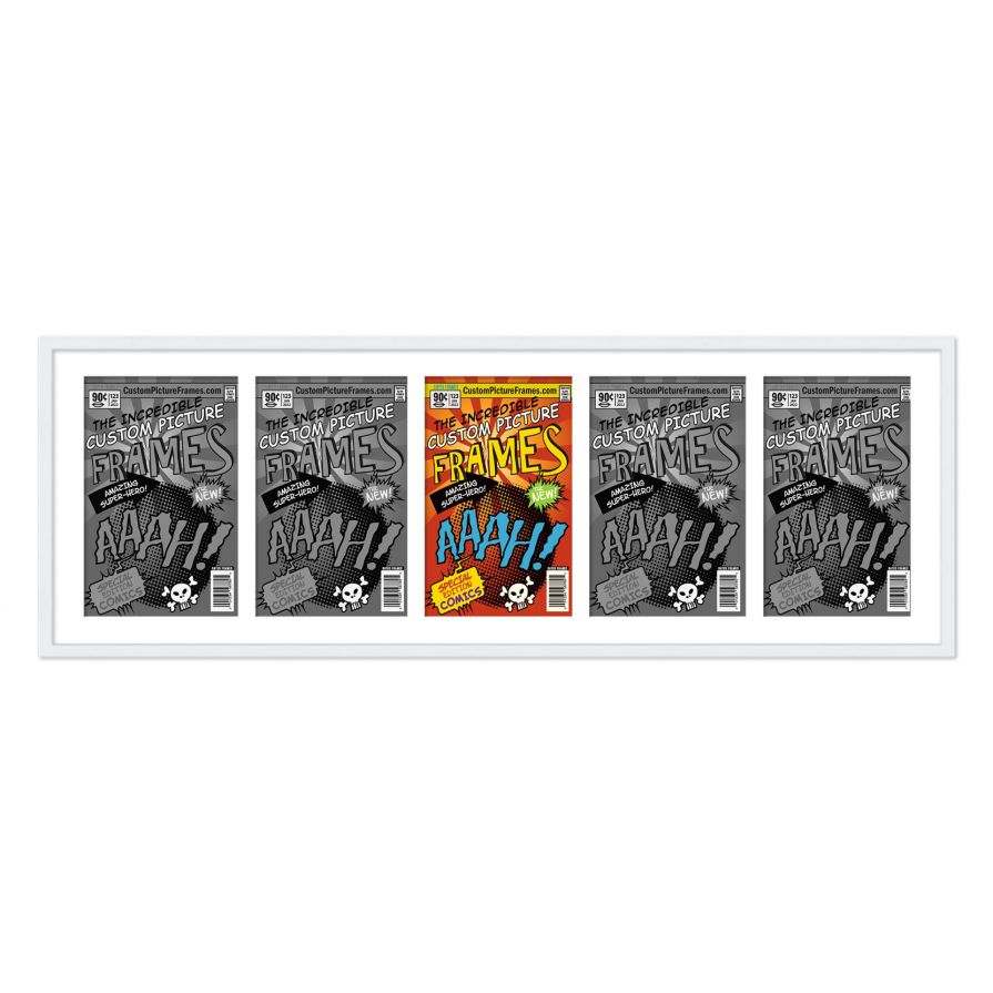 Share your comic collection by putting your comic books on display in a high-quality wood frame. Includes nesting foam to snuggly and securely hold your comic books in place. This frame features a white finish and your choice of black or white acid-free matting to display 5 comic books. Also included are a UV-resistant acrylic protective front, foam board backing, easel stand, and wall hanging hardware. This frame displays five Bronze Age (Published Between 1970 and 1985) comic books measuring 7.25x10.5 inches, Golden Age (Published Between 1938 and 1956) comic books measuring 7.75x10.5 inches, Silver Age (Published Between 1956 and 1970) comic books measuring 7.125x10.5 inches or Current Era (Published After 1985) comic books measuring 6.875x10.5 inches. This moulding is 0.75 inches wide. The overall dimensions of this frame are 45.5x15.5 inches. Includes nesting foam to snuggly and securely hold your comic books in place. This comic book frame for your Bronze, Golden, Silver or Current comic books makes a great gift or addition to your home or office! Display your prized comic book collection in style with a handcrafted frame by Custom Picture Frames.