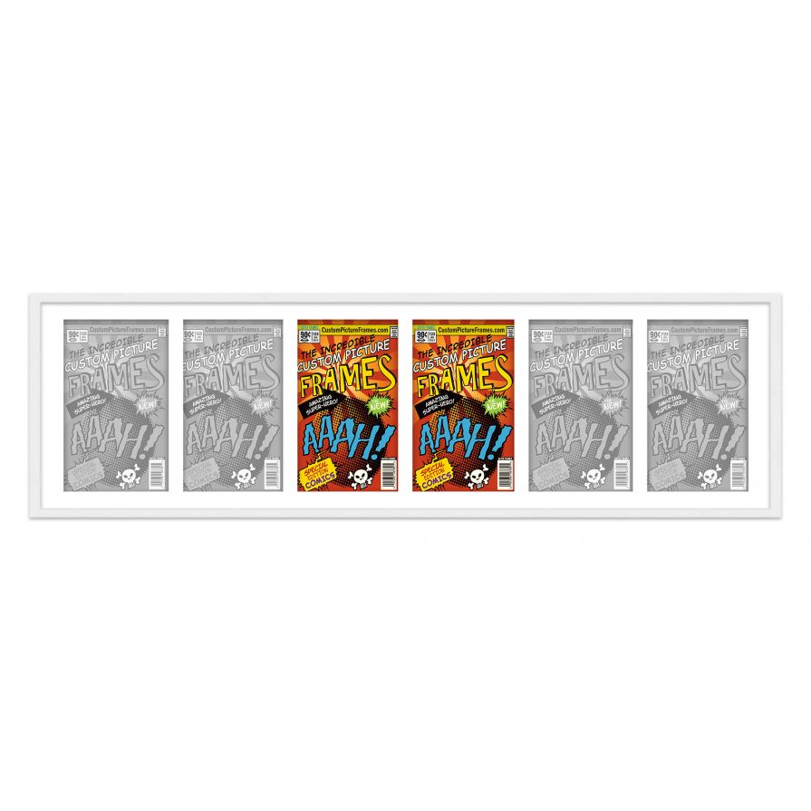 Share your comic collection by putting your comic books on display in a high-quality wood frame. Includes nesting foam to snuggly and securely hold your comic books in place. This frame features a white finish and your choice of black or white acid-free matting to display 6 comic books. Also included are a UV-resistant acrylic protective front, foam board backing, easel stand, and wall hanging hardware. This frame displays six Bronze Age (Published Between 1970 and 1985) comic books measuring 7.25x10.5 inches, Golden Age (Published Between 1938 and 1956) comic books measuring 7.75x10.5 inches, Silver Age (Published Between 1956 and 1970) comic books measuring 7.125x10.5 inches or Current Era (Published After 1985) comic books measuring 6.875x10.5 inches. This moulding is 0.75 inches wide. The overall dimensions of this frame are 52.5x15.5 inches. Includes nesting foam to snuggly and securely hold your comic books in place. This comic book frame for your Bronze, Golden, Silver or Current comic books makes a great gift or addition to your home or office! Display your prized comic book collection in style with a handcrafted frame by Custom Picture Frames.