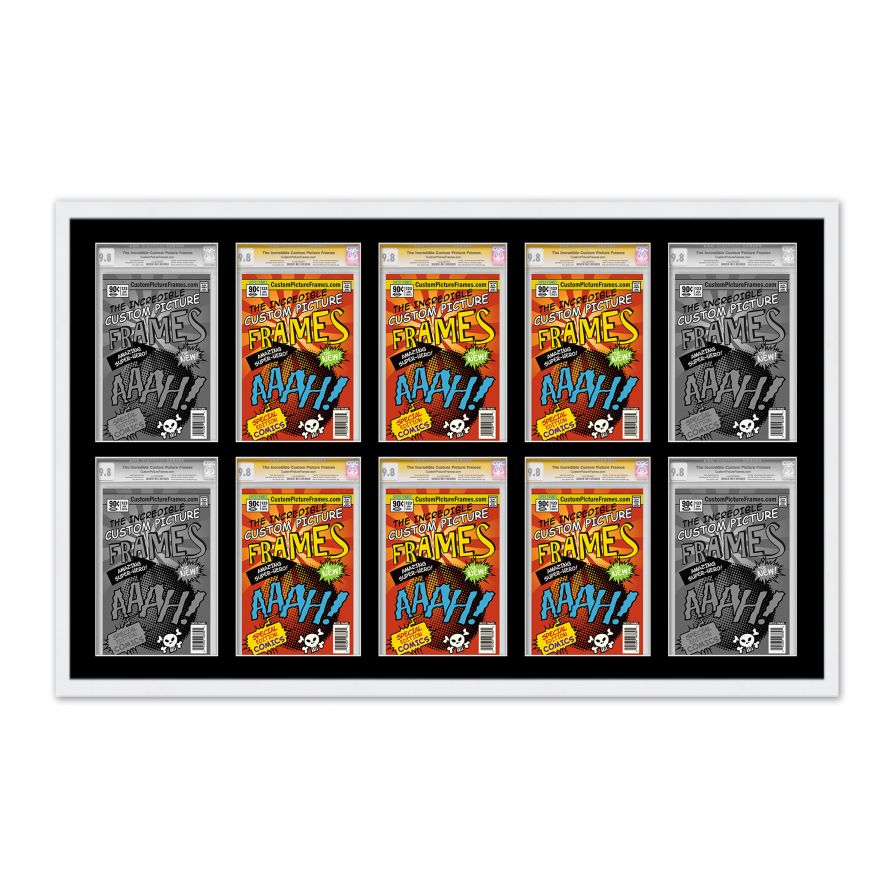 Share your comic collection by putting your comic books on display in a high-quality wood frame. Includes nesting foam to snuggly and securely hold your comic books in place. This frame features a white finish and your choice of black or white acid-free matting to display 10 graded comic books horizontally. Also included are a UV-resistant acrylic protective front, foam board backing, easel stand, and wall hanging hardware. This frame displays ten CGC, CBCS or PGX graded comic books measuring 8.125x13 inches. This moulding is 0.75 inches wide. The overall dimensions of this frame are 45.5x29.75 inches. Includes nesting foam to snuggly and securely hold your comic books in place. This graded comic book frame for your CGC, CBCS or PGX graded comic books makes a great gift or addition to your home or office! Display your prized comic book collection in style with a handcrafted frame by Custom Picture Frames.