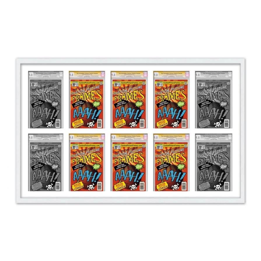 This frame features a white finish and your choice of black or white acid-free matting to display 10 graded comic books horizontally. Also included are a UV-resistant acrylic protective front, foam board backing, easel stand, and wall hanging hardware. This frame displays ten CGC, CBCS or PGX graded comic books measuring 8.125x13 inches. This moulding is 0.75 inches wide. The overall dimensions of this frame are 45.5x29.75 inches.