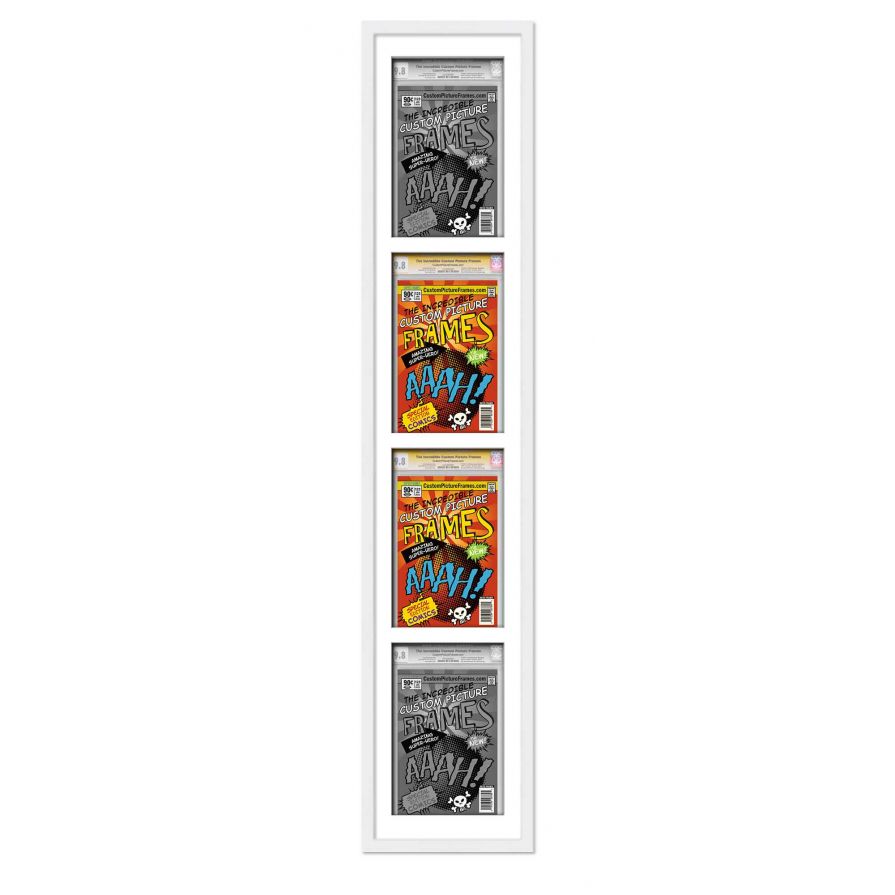 Share your comic collection by putting your comic books on display in a high-quality wood frame. Includes nesting foam to snuggly and securely hold your comic books in place. This frame features a white finish and your choice of black or white acid-free matting to display 4 graded comic books vertically. Also included are a UV-resistant acrylic protective front, foam board backing, easel stand, and wall hanging hardware. This frame displays four CGC, CBCS or PGX graded comic books measuring 8.125x13 inches. This moulding is 0.75 inches wide. The overall dimensions of this frame are 13.125x58.5 inches. Includes nesting foam to snuggly and securely hold your comic books in place. This graded comic book frame for your CGC, CBCS or PGX graded comic books makes a great gift or addition to your home or office! Display your prized comic book collection in style with a handcrafted frame by Custom Picture Frames.