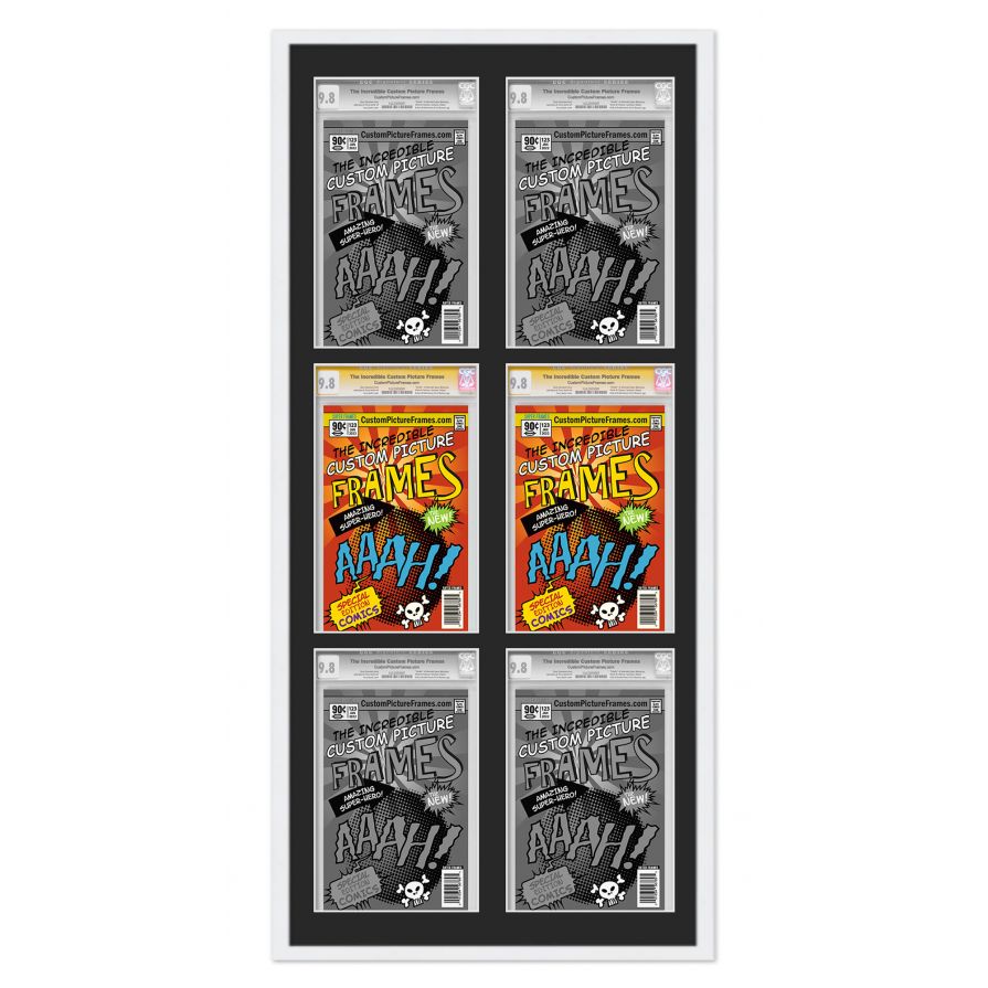 Share your comic collection by putting your comic books on display in a high-quality wood frame. Includes nesting foam to snuggly and securely hold your comic books in place. This frame features a white finish and your choice of black or white acid-free matting to display 6 graded comic books vertically. Also included are a UV-resistant acrylic protective front, foam board backing, easel stand, and wall hanging hardware. This frame displays six CGC, CBCS or PGX graded comic books measuring 8.125x13 inches. This moulding is 0.75 inches wide. The overall dimensions of this frame are 22.25x46 inches. Includes nesting foam to snuggly and securely hold your comic books in place. This graded comic book frame for your CGC, CBCS or PGX graded comic books makes a great gift or addition to your home or office! Display your prized comic book collection in style with a handcrafted frame by Custom Picture Frames.
