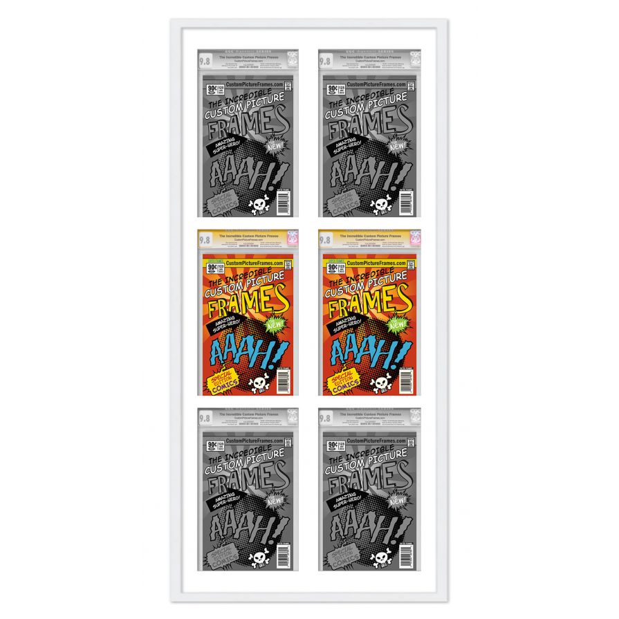 Share your comic collection by putting your comic books on display in a high-quality wood frame. Includes nesting foam to snuggly and securely hold your comic books in place. This frame features a white finish and your choice of black or white acid-free matting to display 6 graded comic books vertically. Also included are a UV-resistant acrylic protective front, foam board backing, easel stand, and wall hanging hardware. This frame displays six CGC, CBCS or PGX graded comic books measuring 8.125x13 inches. This moulding is 0.75 inches wide. The overall dimensions of this frame are 22.25x46 inches. Includes nesting foam to snuggly and securely hold your comic books in place. This graded comic book frame for your CGC, CBCS or PGX graded comic books makes a great gift or addition to your home or office! Display your prized comic book collection in style with a handcrafted frame by Custom Picture Frames.