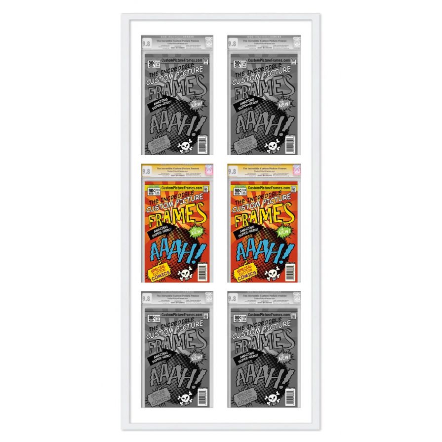 Share your comic collection by putting your comic books on display in a high-quality wood frame. Includes nesting foam to snuggly and securely hold your comic books in place. This frame features a white finish and your choice of black or white acid-free matting to display 6 graded comic books vertically. Also included are a UV-resistant acrylic protective front, foam board backing, easel stand, and wall hanging hardware. This frame displays six CGC, CBCS or PGX graded comic books measuring 8.125x13 inches. This moulding is 0.75 inches wide. The overall dimensions of this frame are 22.25x46 inches. Includes nesting foam to snuggly and securely hold your comic books in place. This graded comic book frame for your CGC, CBCS or PGX graded comic books makes a great gift or addition to your home or office! Display your prized comic book collection in style with a handcrafted frame by Custom Picture Frames.