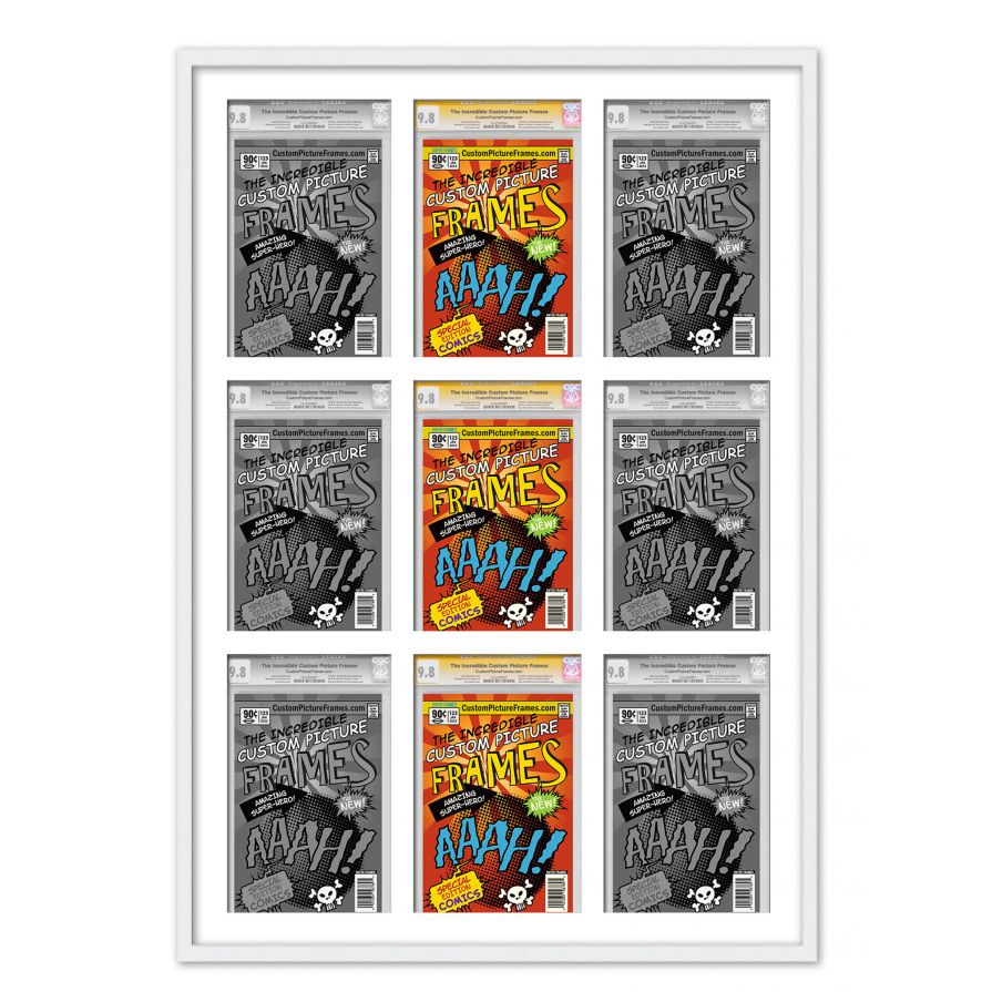 Share your comic collection by putting your comic books on display in a high-quality wood frame. Includes nesting foam to snuggly and securely hold your comic books in place. This frame features a white finish and your choice of black or white acid-free matting to display 9 graded comic books. Also included are a UV-resistant acrylic protective front, foam board backing, easel stand, and wall hanging hardware. This frame displays nine CGC, CBCS or PGX graded comic books measuring 8.125x13 inches. This moulding is 0.75 inches wide. The overall dimensions of this frame are 31.5x46 inches. Includes nesting foam to snuggly and securely hold your comic books in place. This graded comic book frame for your CGC, CBCS or PGX graded comic books makes a great gift or addition to your home or office! Display your prized comic book collection in style with a handcrafted frame by Custom Picture Frames.