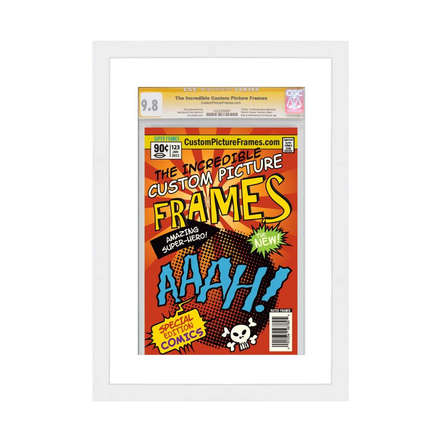 Share your comic collection by putting your comic books on display in a high-quality wood frame.This frame features a white finish and your choice of black or white acid-free matting to fit your graded comic book. Also included are a UV-resistant acrylic protective front, foam board backing, easel stand, and wall hanging hardware. This frame displays 1 CGC, CBCS or PGX graded comic book measuring 8.125x13 inches. This moulding is 0.75 inches wide. The overall dimensions of this frame are 13.5"x18.5" inches. Includes nesting foam to snuggly and securely hold your comic books in place. This single graded comic book frame for your CGC, CBCS or PGX graded comic books makes a great gift or addition to your home or office! Display your prized comic book collection in style with a handcrafted frame by Custom Picture Frames.